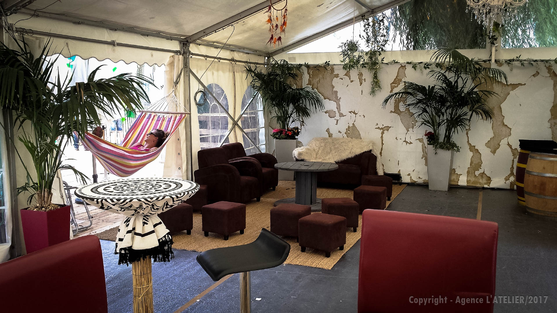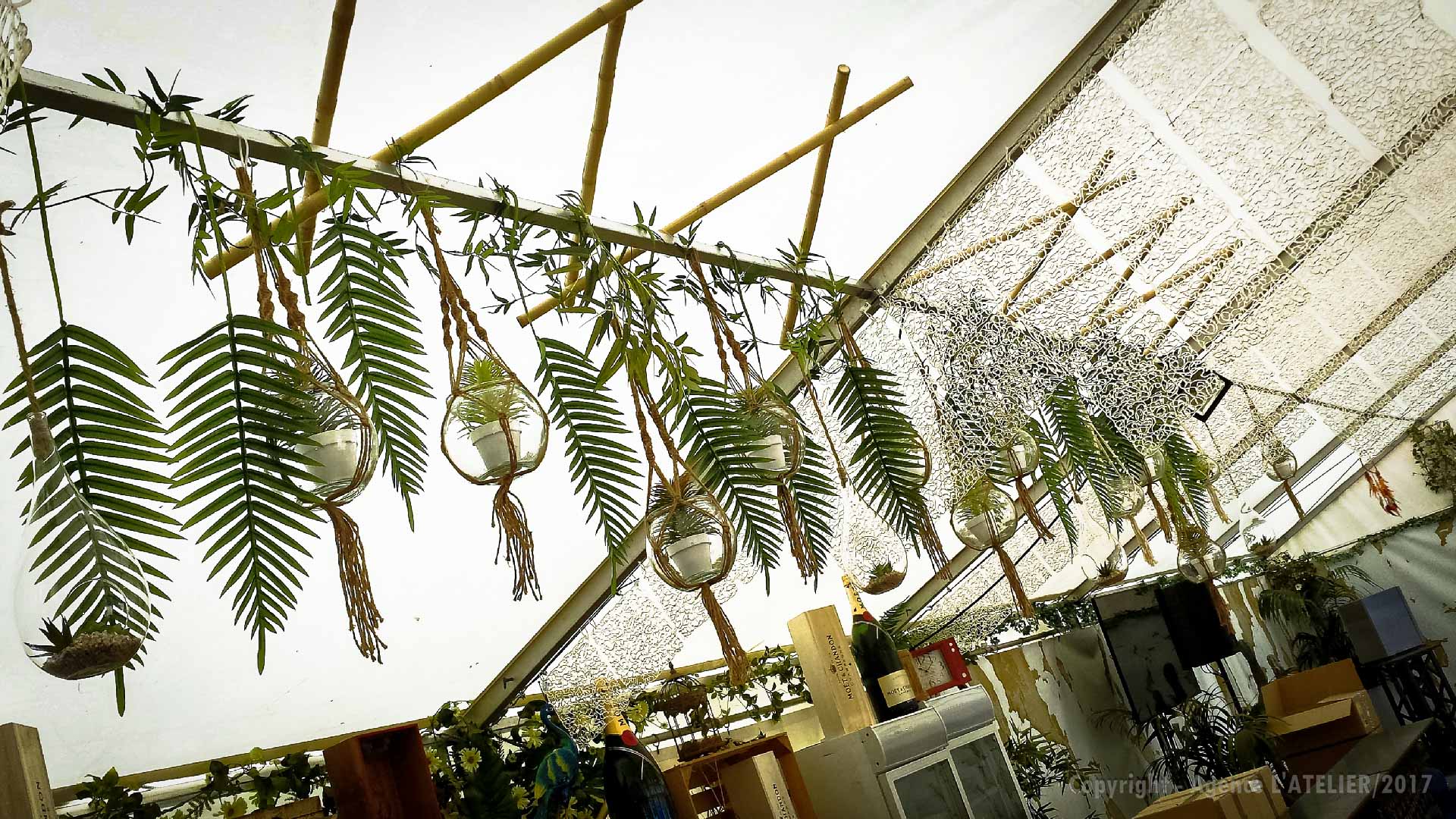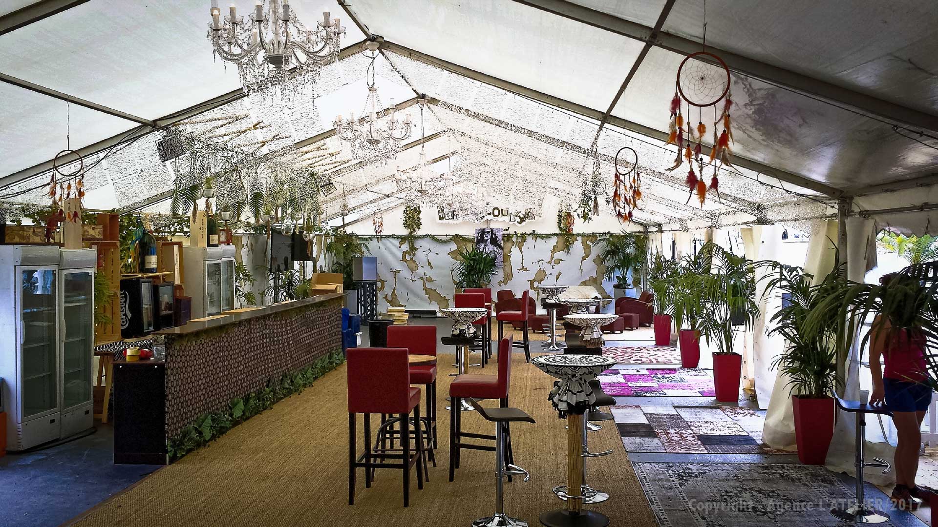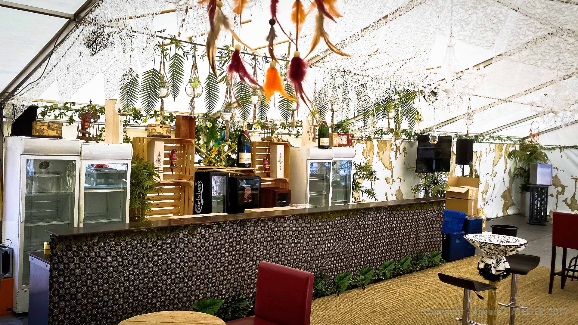 Un immense plaisir car c’est pour nous l’occasion d’exprimer toute notre créativité et de mettre en action tout notre savoir-faire. Nous remercions chaleureusement Lisa et toute l’équipe de SF EVENTS pour la confiance qu’elle nous accorde chaque année pour donner vie à cet espace VIP. Rendons à César ce qui appartient à César, Lisa est à l’origine de la thématique de cette année : Hippie chic, bohème, jungle… A partir de ces 4 mots nous avons pensé l’univers global en traitant à la fois l’aérien, les cloisons, le sol, le mobilier dans les différents espaces du chapiteau (coin cosy, coin relax, espace mange debout, espace bar à vin, terrasse …). Après 3 jours de travail sous une chaleur accablante, ce chapiteau vide et nu s’est peu à peu transformé pour aboutir au résultat escompté.