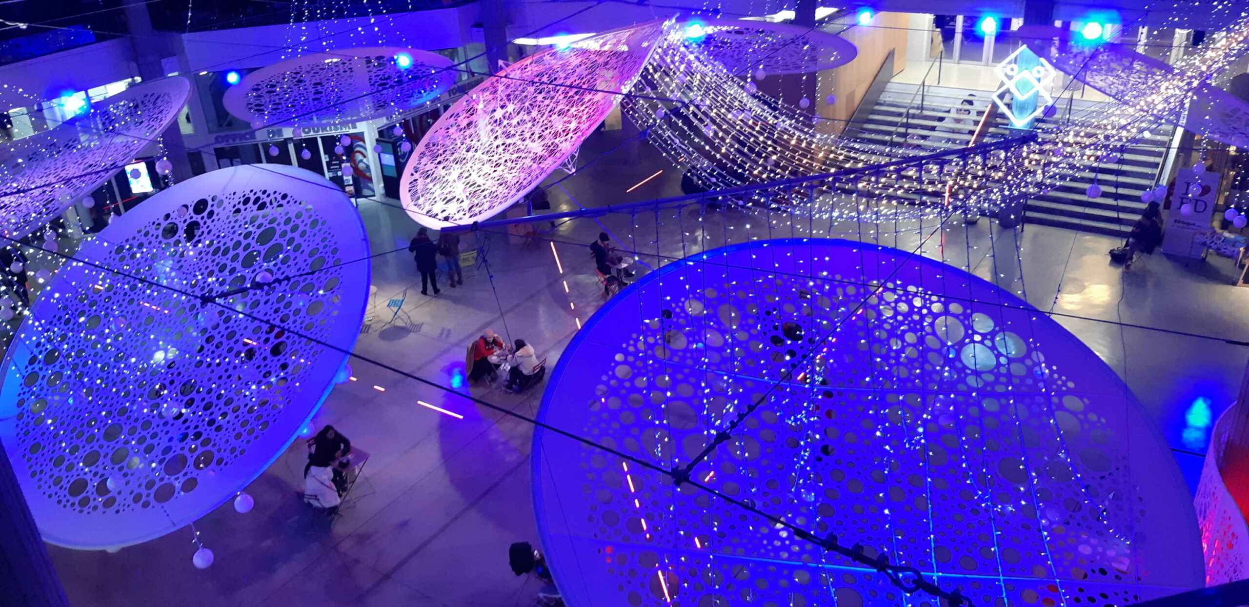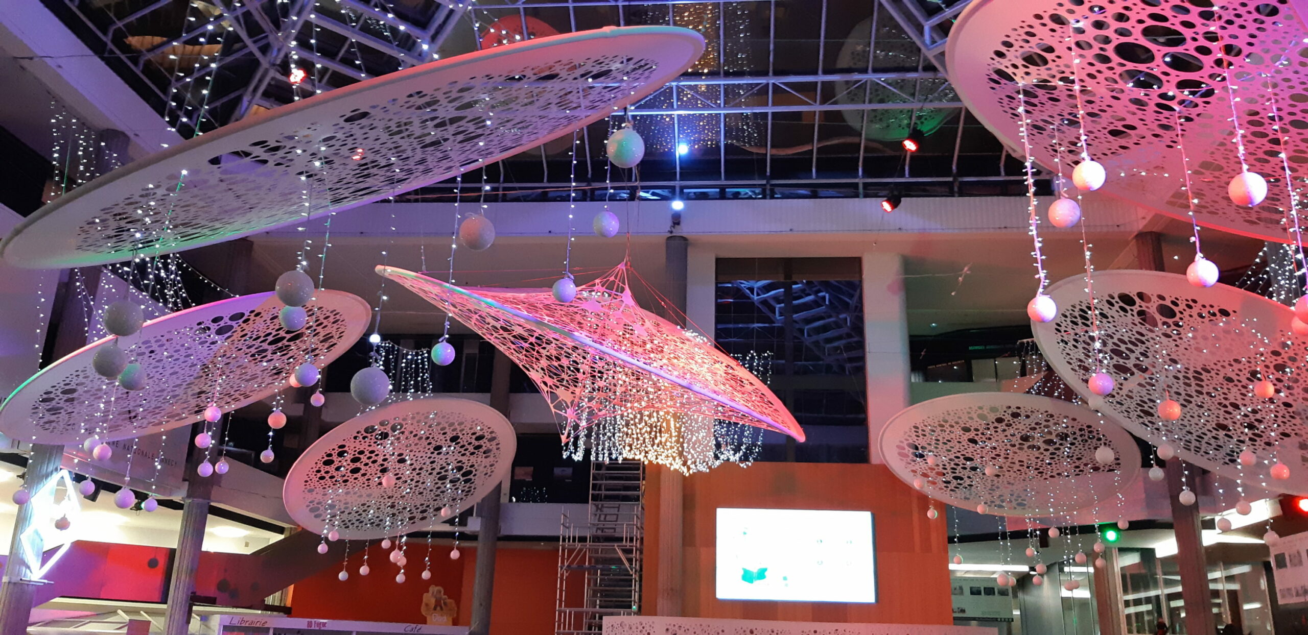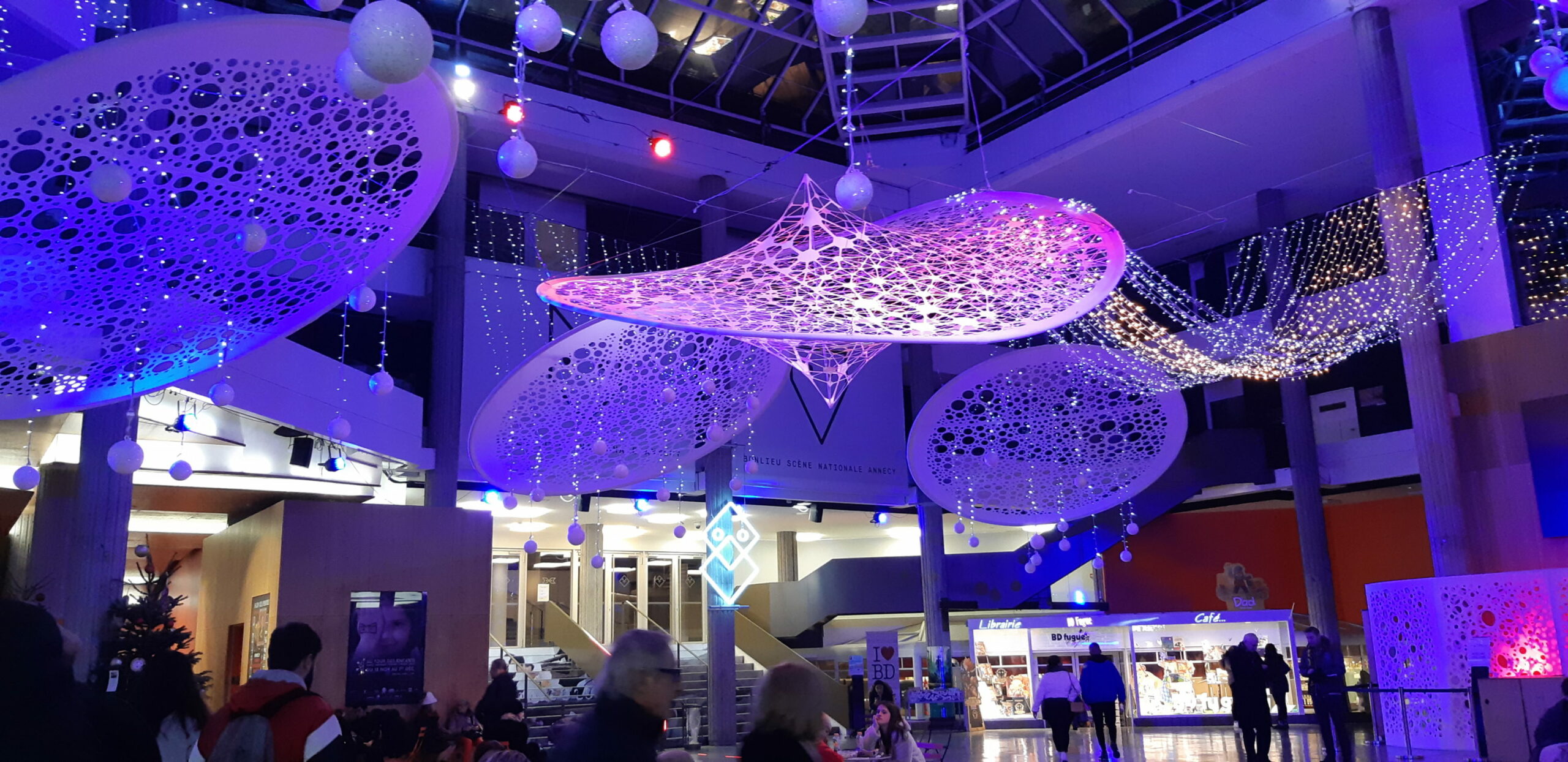 Tout en respectant la magie et la féerie de noël, ce décor aérien et contemporain s’intègre parfaitement dans ce lieu emblématique de la culture Annecienne.