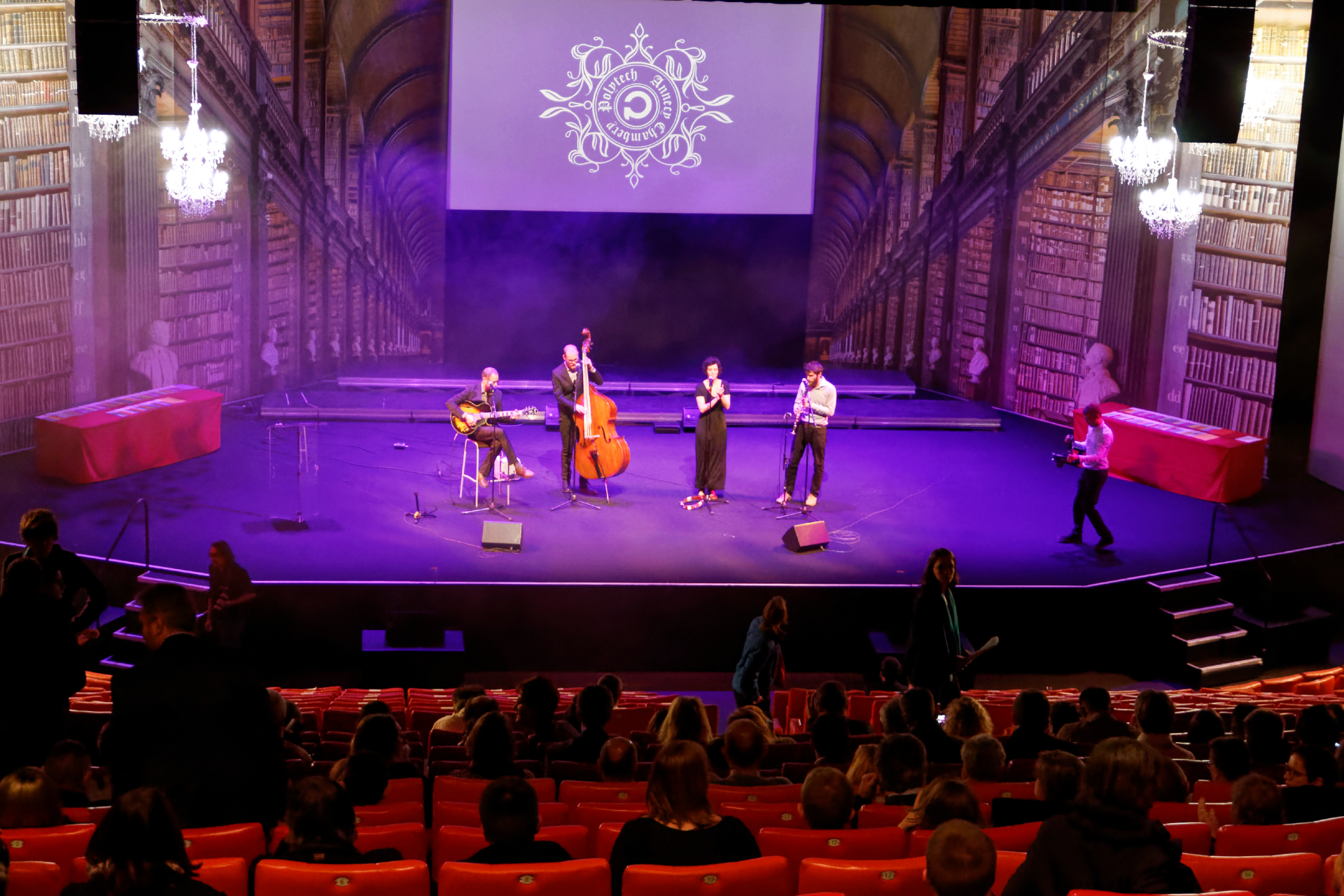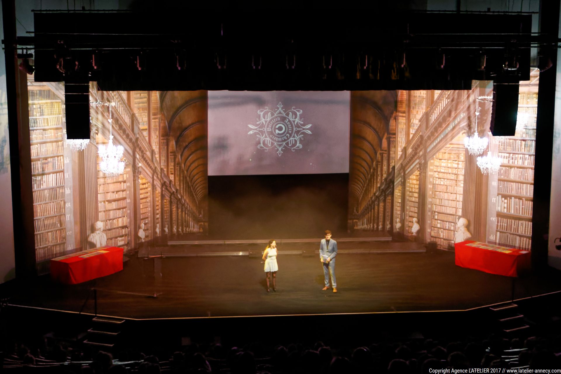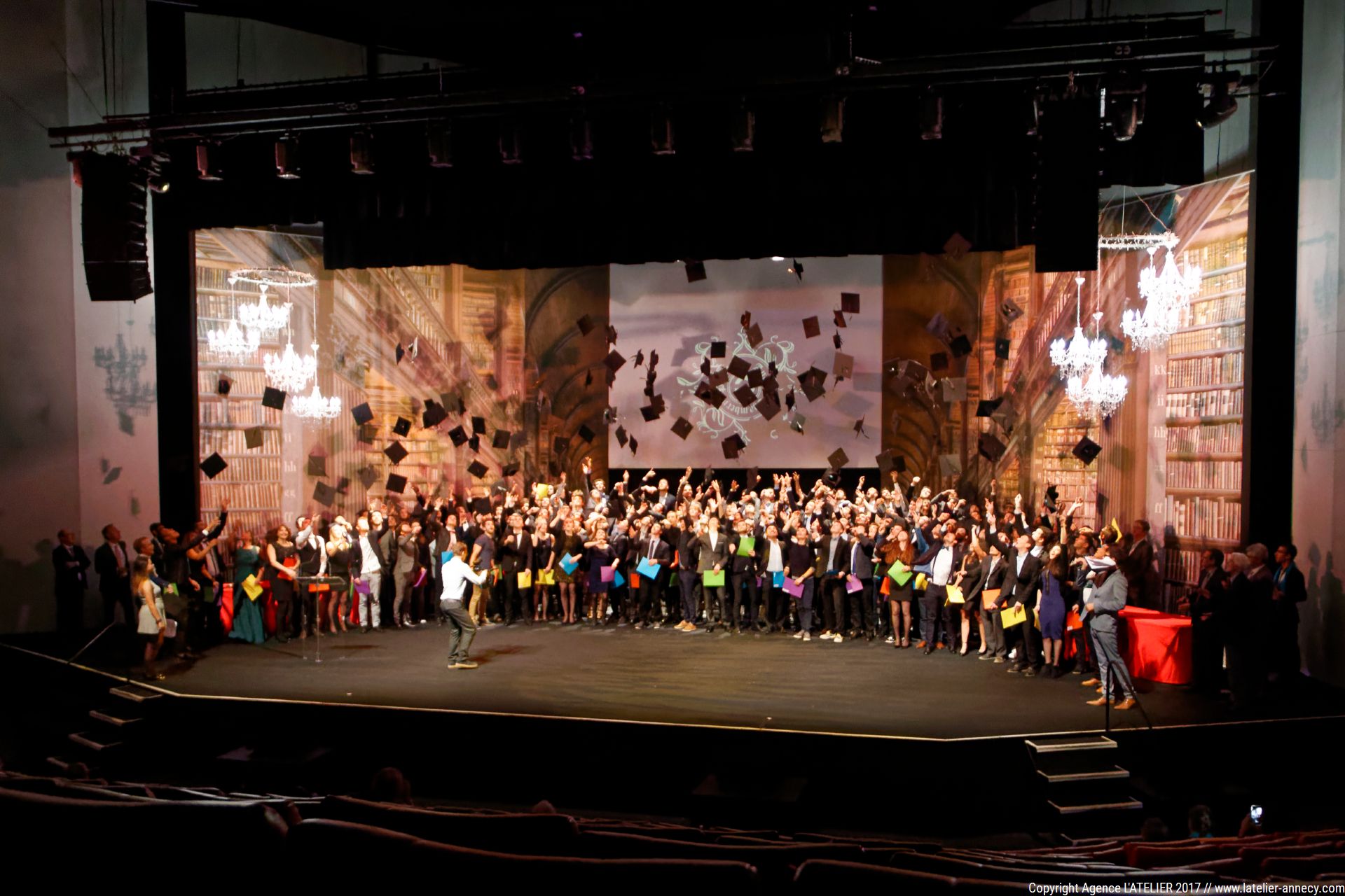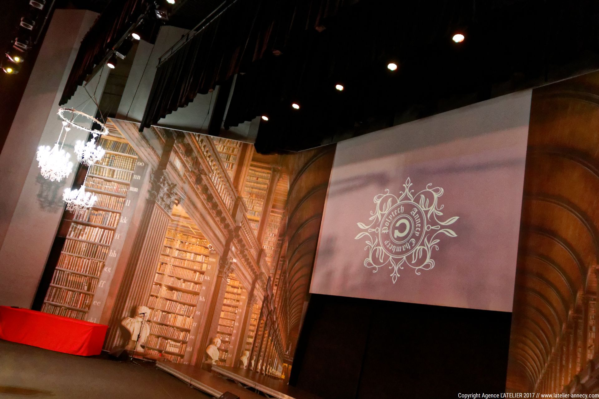 Samedi 18 Novembre, POLYTECH Annecy Chambéry célébrait ses 180 nouveaux diplômés au Centre des Congrès d’Aix-Les-Bains. Comme chaque année, cette cérémonie se veut unique, grandiose, pour célébrer à sa juste valeur cette remise de diplôme qui marque une étape majeure dans la vie de ces jeunes diplômés. L’ATELIER accompagne POLYTECH Annecy Chambéry depuis plusieurs années et cette cérémonie représente pour nous un vrai challenge. Savoir se renouveler, réinventer des décors, être force de proposition, innover, mettre en place de nouvelles techniques… Ce challenge nous avons su le relever, en collaboration avec le service communication, et nous sommes très fier de la scénographie de cette année. Ce décor de 6m50 de haut par 16m de large nous plonge dans un univers à la fois onirique, scientifique, mystérieux, magique parfois…