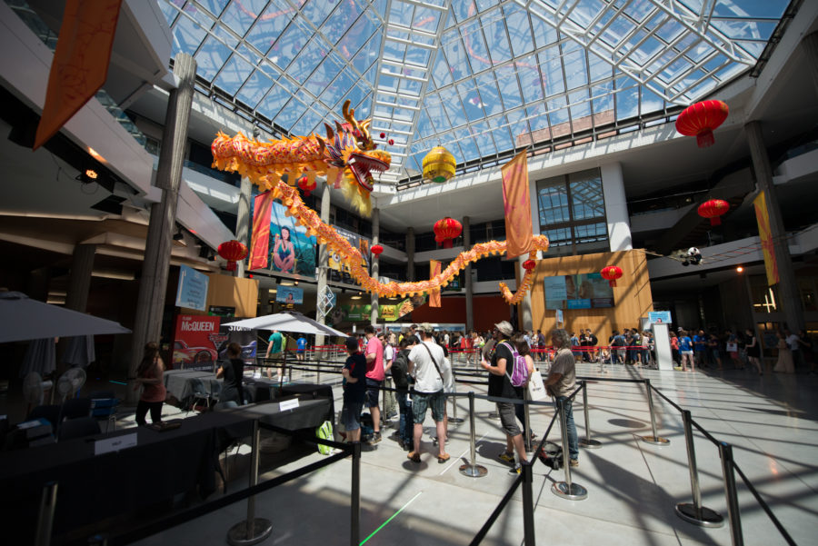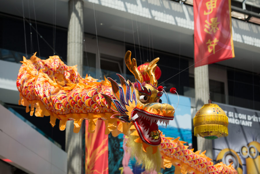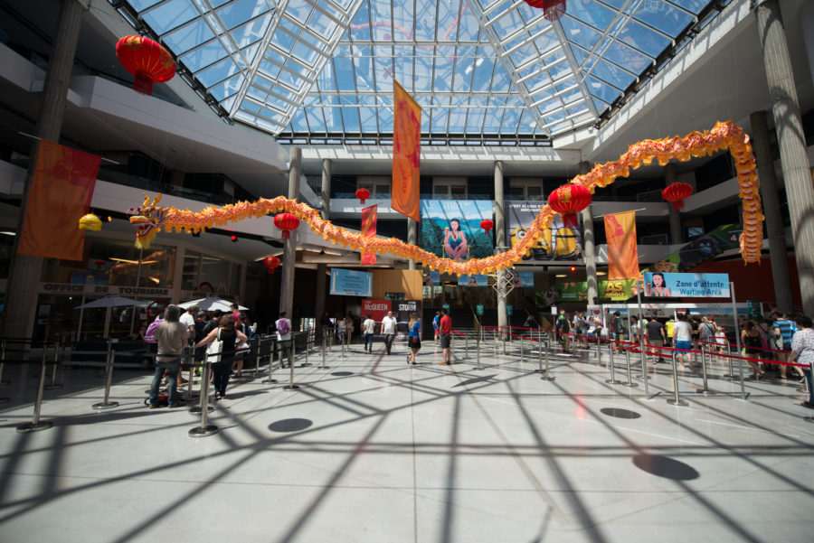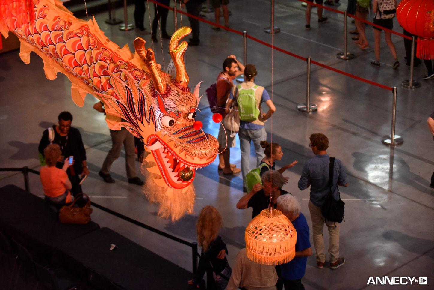 Occuper l’espace global sans masquer les espaces de communication, intervenir efficacement en prenant en compte les contraintes du lieu et son architecture, mettre en valeur le pays à l’honneur, voici une partie du cahier des charges de la scénographie principale du Festival d’Animation au centre BONLIEU. A partir du cahier des charges et sans tomber dans les clichés / Poncifs relatifs à la culture chinoise nous avons proposé une scénographie axée autour d’1 pièce maîtresse. Représentant la grandeur, la puissance et symbole du Yang, principe de vie et de croissance : Le dragon