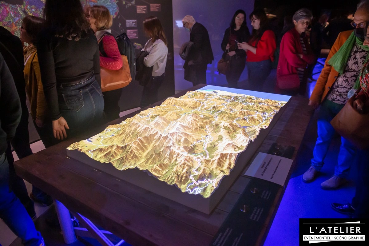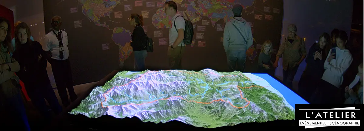 Ce dispositif est constitué d’une maquette relief de montagne animé par projection d’un film didactique en « vidéo mapping » et accompagné d’une voix off.