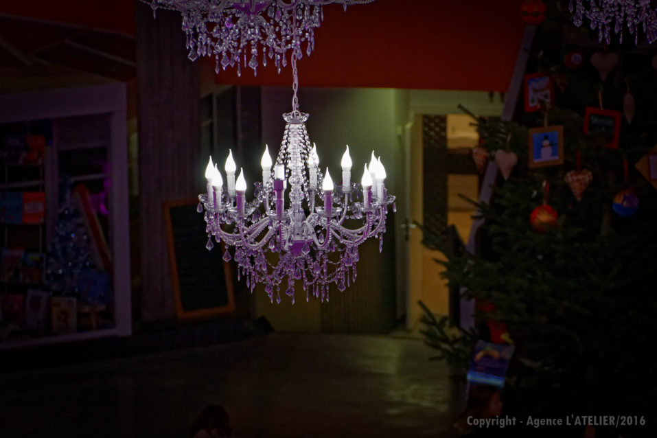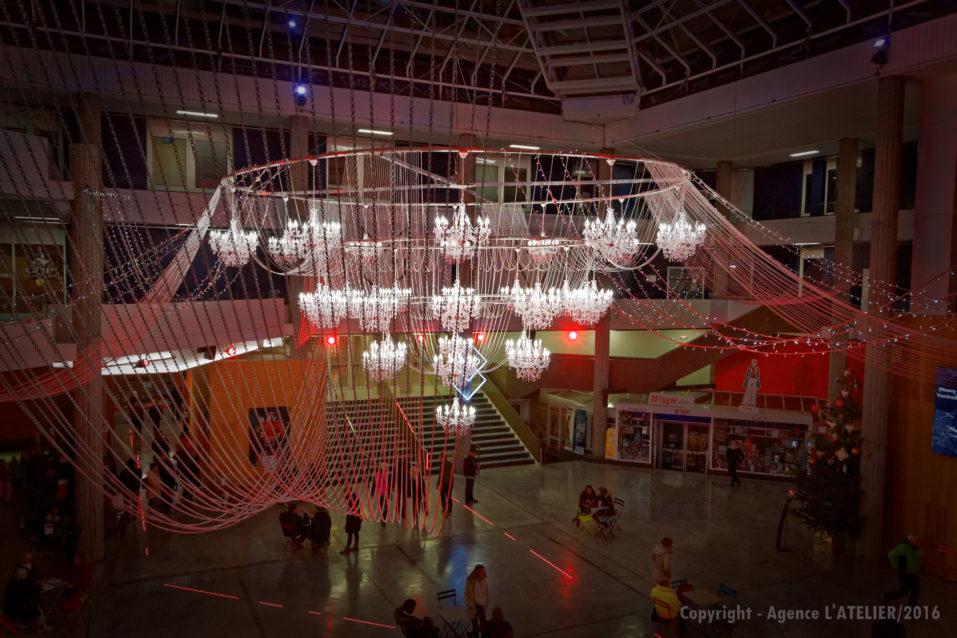 Nous avons proposé un lustre géant composé de 31 lustres et quelques 360 ampoules LED, le tout accompagné de guirlande de LED et LED Flash.